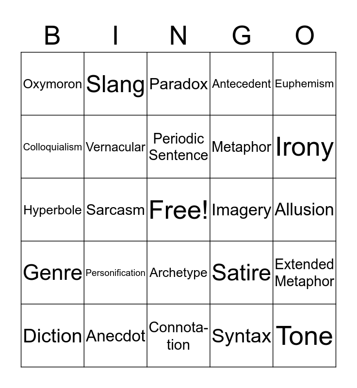 This bingo card has a free space and 29 words: Diction, Parody, Sarcasm, Alliteration, Oxymoron, Paradox, Vernacular, Personification, Imagery, Anecdot, Allusion, Tone, Connota-tion, Syntax, Irony, Jargon, Archetype, Genre, Euphemism, Hyperbole, Satire, Simile, Metaphor, Colloquialism, Antecedent, Slang, Extended Metaphor, Periodic Sentence and Ellipsis.