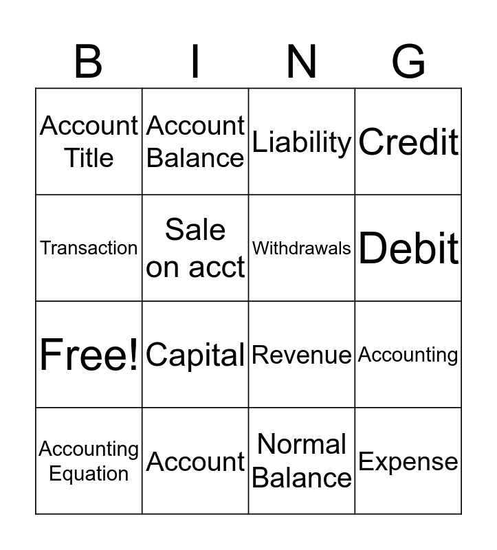 This bingo card has 20 words: Accounting, Asset, Liability, Owners Equity, Accounting Equation, Transaction, Account, Account Title, Free!, Account Balance, Capital, Revenue, Sale on acct, Expense, Withdrawals, T Acct, Debit, Credit, Normal Balance and Chart of accts.