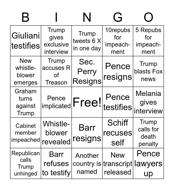 This bingo card has a free space and 29 words: Republican calls Trump unhinged, 25th Amend-ment invoked, Pence implicated, Trump resigns, Giuliani testifies, Trump tweets 6 X in one day, Trump accuses R of Treason, Whistle-blower revealed, Pence testifies, Barr refuses to testify, Melania gives interview, Pence lawyers up, Another country is named, New transcript released, Trump blasts Fox news, Trump files lawsuit, Barr resigns, Cabinet member impeached, 5 Repubs for impeach-ment, Graham turns against Trump, Schiff recuses self, Trump impeached by House, Pence resigns, New whistle-blower emerges, 10repubs for impeach- ment, Trump gives exclusive interview, Trump calls for death penalty, Sec. Perry Resigns and Giuliani disbarred.