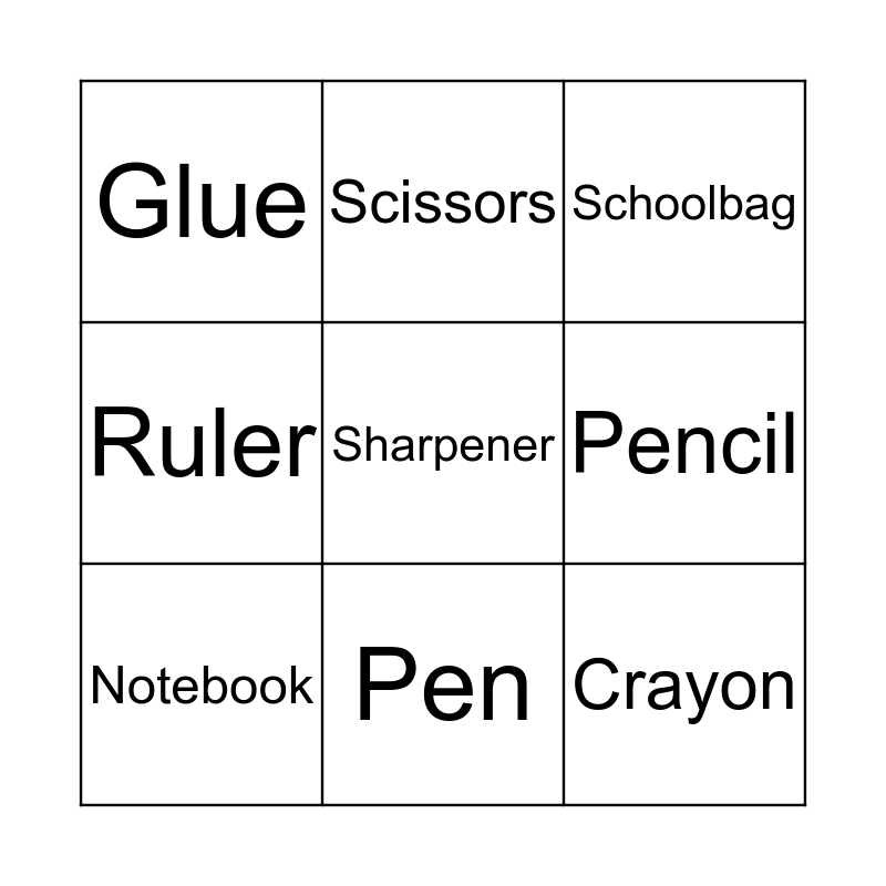 This bingo card has a free space and 12 words: Book, Eraser Rubber, Pencil, Notebook, Schoolbag, Ruler, Pen, Pencil case, Glue, Scissors, Crayon and Folder.