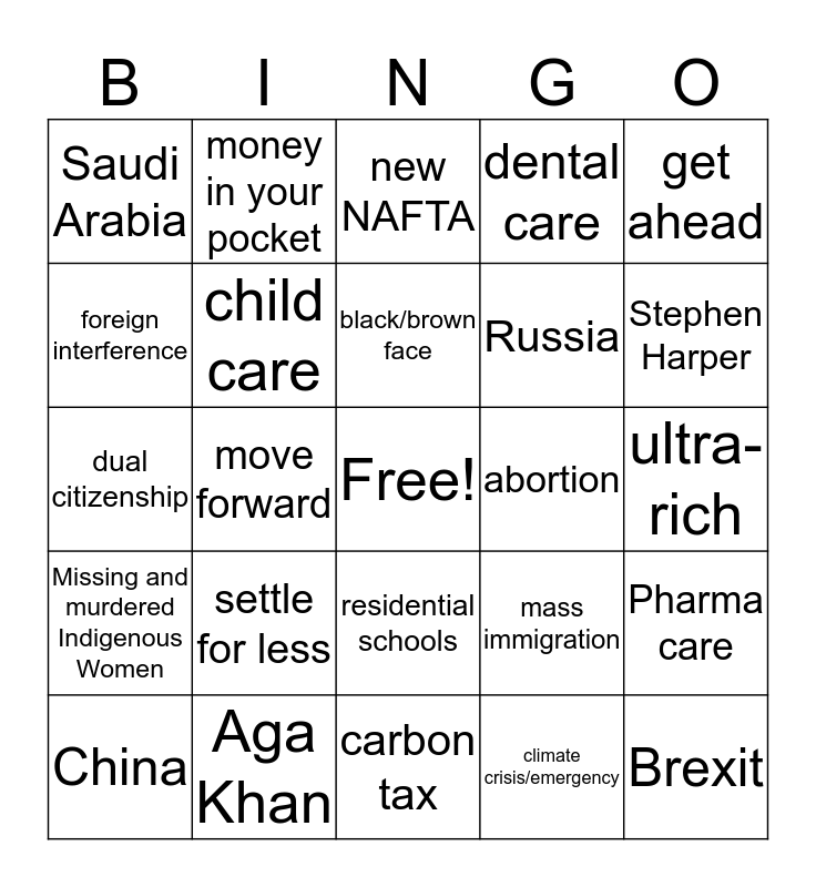 This bingo card has a free space and 48 words: make life more affordable, Brexit, Balanced budget, carbon tax, settle for less, middle class, money in your pocket, pipeline, foreign interference, SNC Lavalin, child care, dental care, Pharma care, mass immigration, foreign aid, innovation, black/brown face, abortion, waive Cabinet confidence, get ahead, move forward, climate crisis/emergency, Saudi Arabia, Russia, not as advertised, Stephen Harper, China, foreign aid, residential schools, Missing and murdered Indigenous Women, Doug Ford, Donald Trump, Bill 21, Bill C-69, Aga Khan, Grassy Narrows, Housing costs, ultra-rich, clean energy economy, fossil fuel subsidies, energy corridor, Canada Child Benefit, new NAFTA, assisted dying, dual citizenship, two planes, Huawei and gun violence.