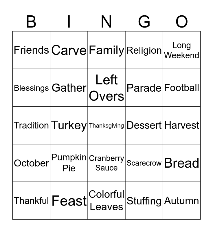 This bingo card has a free space and 29 words: Thankful, Gratitude, Turkey, Gobble, Friends, Family, Gather, Pumpkin Pie, Dessert, Feast, Harvest, Autumn, Colorful Leaves, Stuffing, Football, Gravy, Cranberry Sauce, October, Long Weekend, Tradition, Scarecrow, Celebrate, Parade, Blessings, Religion, Carve, Bread, Left Overs and Pilgrims.