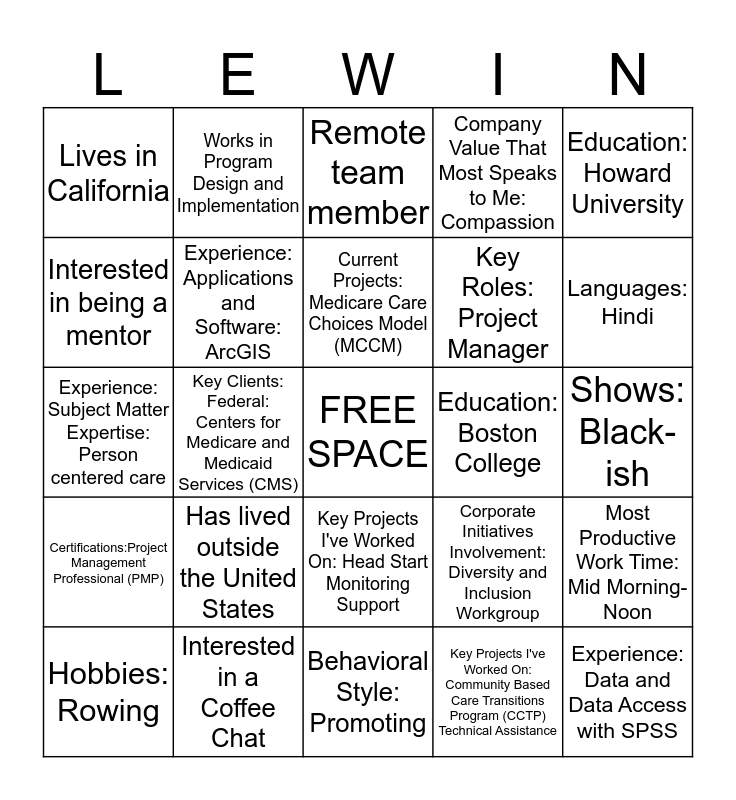 This bingo card has a free space and 24 words: Hobbies: Rowing, Has lived outside the United States, Current Projects: Medicare Care Choices Model (MCCM), Key Projects I've Worked On: Community Based Care Transitions Program (CCTP) Technical Assistance, Education: Howard University, Lives in California, Works in Program Design and Implementation, Remote team member, Education: Boston College, Shows: Black-ish, Experience: Subject Matter Expertise: Person centered care, Experience: Applications and Software: ArcGIS, Corporate Initiatives Involvement: Diversity and Inclusion Workgroup, Most Productive Work Time: Mid Morning-Noon, Interested in being a mentor, Interested in a Coffee Chat, Behavioral Style: Promoting, Company Value That Most Speaks to Me: Compassion, Languages: Hindi, Certifications:Project Management Professional (PMP), Key Clients: Federal: Centers for Medicare and Medicaid Services (CMS), Key Projects I've Worked On: Head Start Monitoring Support, Key Roles: Project Manager and Experience: Data and Data Access with SPSS.