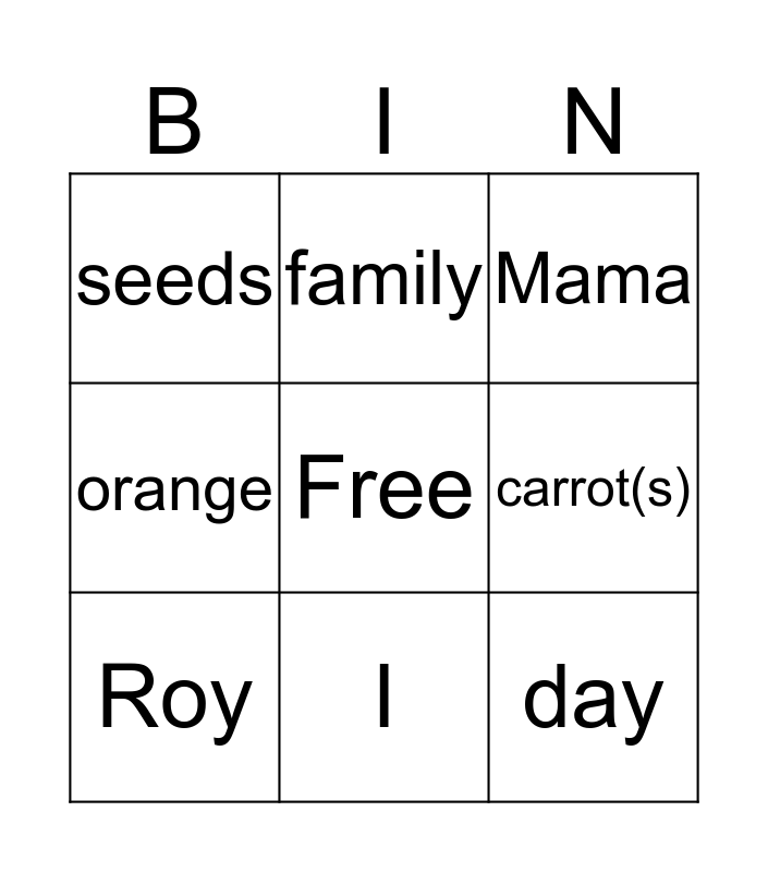 This bingo card has a free space and 9 words: Roy, Mama, family, orange, seeds, carrot(s), day, school and I.