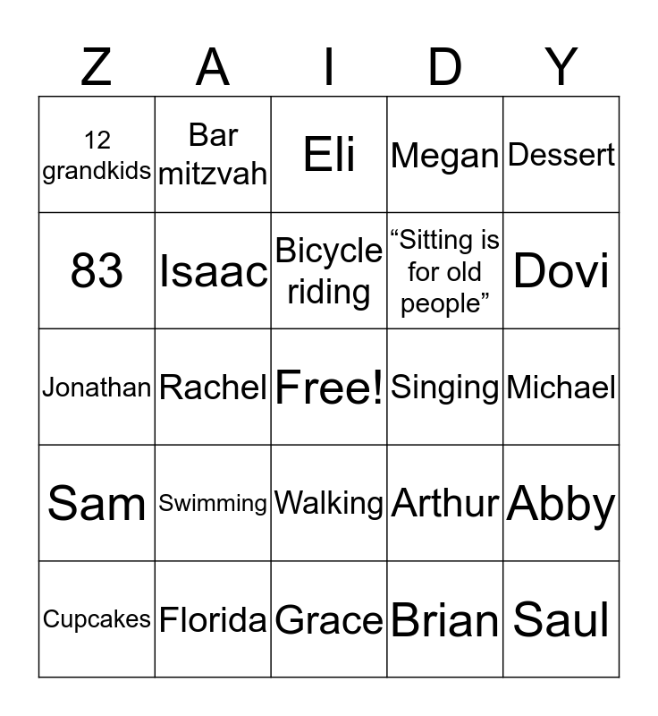 This bingo card has a free space and 24 words: Swimming, Florida, Bicycle riding, Cupcakes, Dessert, 12 grandkids, 83, Bar mitzvah, Singing, Walking, “Sitting is for old people”, Jonathan, Arthur, Abby, Isaac, Brian, Michael, Eli, Dovi, Rachel, Saul, Sam, Megan and Grace.