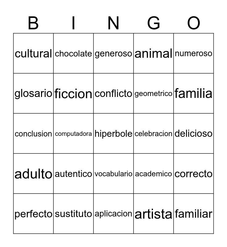 This bingo card has 25 words: autentico, aplicacion, conflicto, perfecto, numeroso, cultural, glosario, chocolate, celebracion, vocabulario, geometrico, conclusion, academico, correcto, ficcion, familiar, delicioso, generoso, familia, computadora, hiperbole, sustituto, adulto, animal and artista.