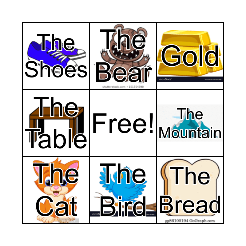 This bingo card has 8 images, a free space and 8 words: The Mountain, Gold, The Bear, The Cat, The Shoes, The Bread, The Table and The Bird.