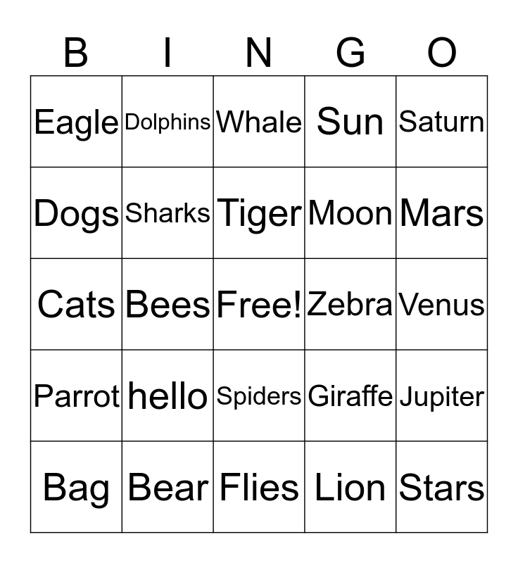 This bingo card has a free space and 24 words: Bag, hello, Tiger, Lion, Saturn, Eagle, Dolphins, Whale, Zebra, Venus, Cats, Sharks, Giraffe, Jupiter, Dogs, Bear, Flies, Sun, Mars, Parrot, Bees, Spiders, Moon and Stars.