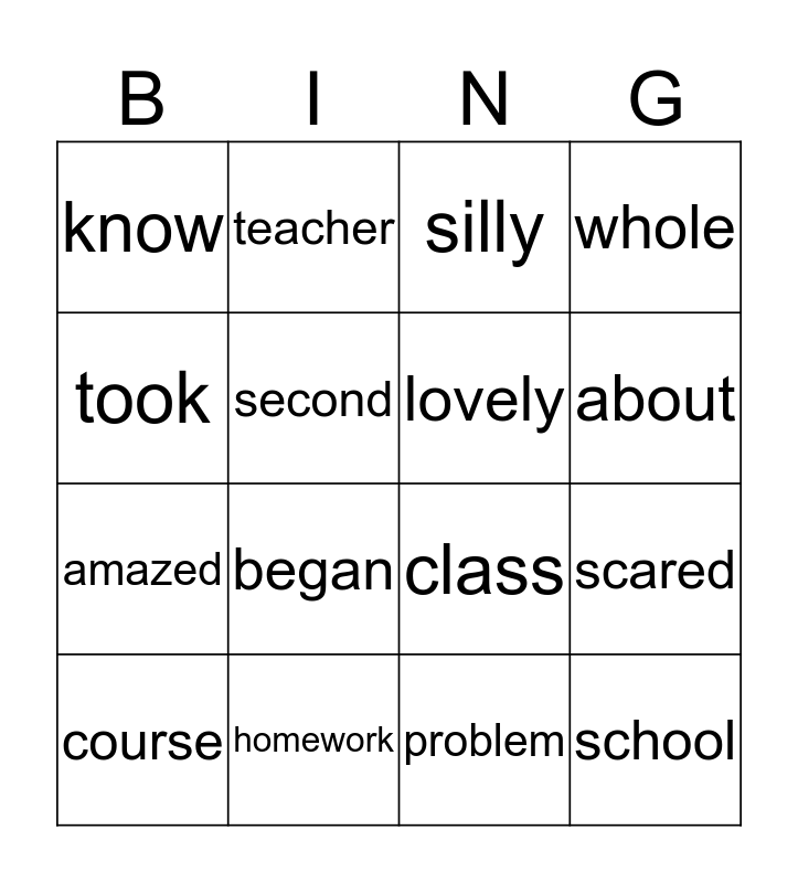 This bingo card has 16 words: homework, scared, silly, know, amazed, teacher, class, problem, took, second, course, whole, began, about, lovely and school.