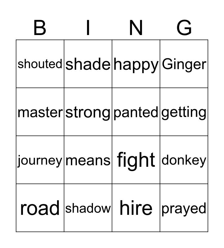 This bingo card has 16 words: shadow, donkey, happy, shouted, journey, shade, fight, hire, master, strong, road, Ginger, means, getting, panted and prayed.