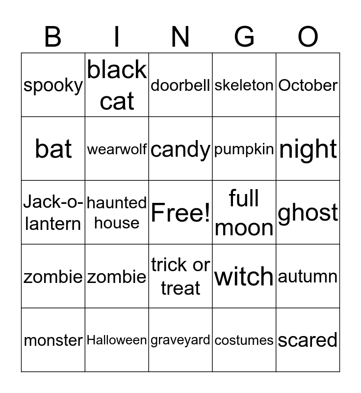 This bingo card has a free space and 26 words: trick or treat, costumes, candy, Halloween, October, spooky, bat, black cat, ghost, witch, pumpkin, Jack-o-lantern, autumn, monster, haunted house, spider web, skeleton, zombie, doorbell, scared, night, graveyard, full moon, zombie, wearwolf and Boo!.