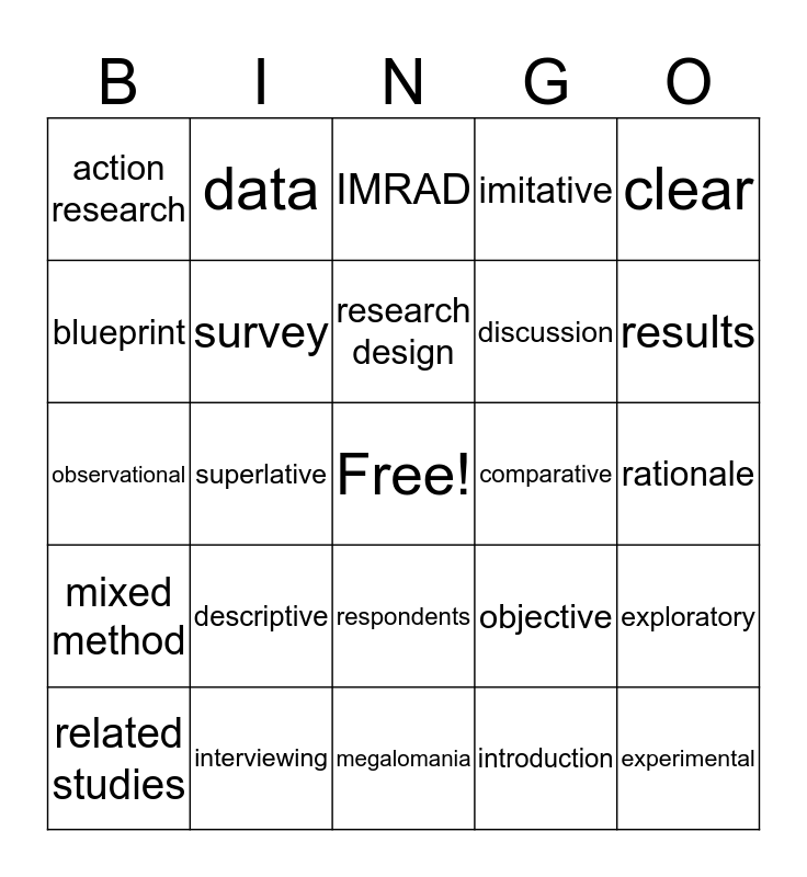 This bingo card has a free space and 29 words: findings, interviewing, IMRAD, significant, clear, action research, survey, research design, comparative, exploratory, related studies, superlative, introduction, experimental, observational, chapter format, megalomania, objective, results, mixed method, descriptive, quantitative, discussion, rationale, blueprint, data, respondents, imitative and researcher.