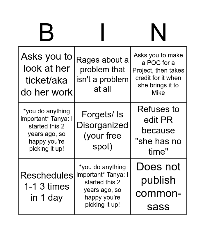 This bingo card has a free space and 8 words: Refuses to edit PR because "she has no time", Asks you to make a POC for a Project, then takes credit for it when she brings it to Mike, Rages about a problem that isn't a problem at all, Reschedules 1-1 3 times in 1 day, Asks you to look at her ticket/aka do her work, Does not publish common-sass, *you do anything important* Tanya: I started this 2 years ago, so happy you're picking it up! and *you do anything important* Tanya: I started this 2 years ago, so happy you're picking it up!.