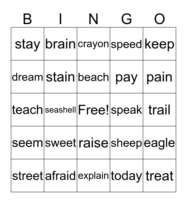 This bingo card has a free space and 24 words: sweet, afraid, beach, street, keep, stay, dream, brain, speak, raise, pay, teach, sheep, eagle, stain, today, trail, crayon, pain, seashell, treat, seem, speed and explain.