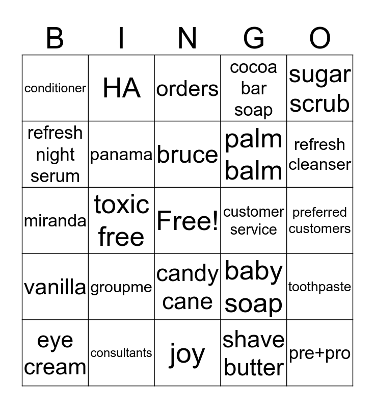 This bingo card has a free space and 29 words: eye cream, by design, toxic free, shampoo, conditioner, orders, panama, groupme, customer service, consultants, preferred customers, pre+pro, joy, shave butter, refresh cleanser, dish soap, candy cane, vanilla, sugar scrub, miranda, baby soap, master blaster, palm balm, refresh night serum, cocoa bar soap, HA, toothpaste, bruce and brandon.