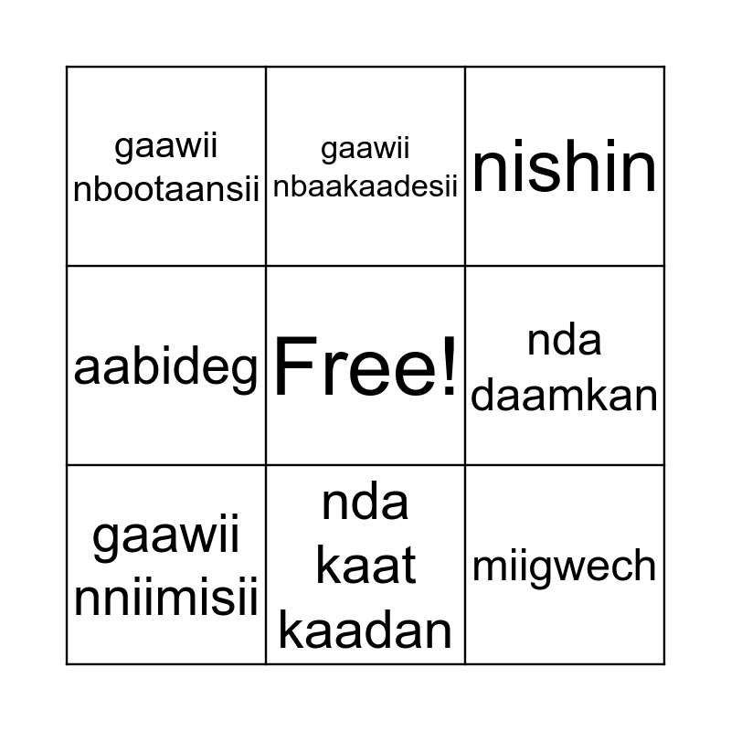 This bingo card has a free space and 11 words: gaawii nmiptosii, nda kaat kaadan, miigwech, gaawii nniimisii, gaawii nbaakaadesii, nishin, nda daamkan, nda wiibit wiibitdan, aabideg, gaawii nbootaansii and nda bakon.