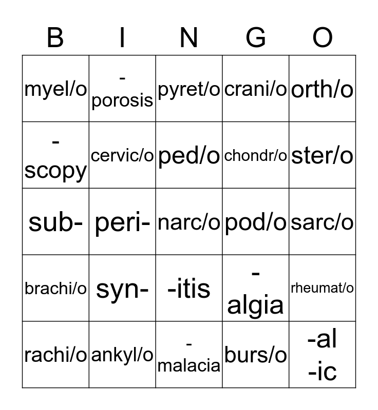 This bingo card has 58 words: acr/o, ankyl/o, arthr/o, brachi/o, burs/o, carp/o, cervic/o, chir/o, chondr/o, cost/o, crani/o, kyph/o, lord/o, lumb/o, lux/o, myel/o, narc/o, orth/o, oste/o, ped/o, pod/o, pyret/o, rachi/o, rheumat/o, sacr/o, sarc/o, scoli/o, spondyl/o, ster/o, synovi/o, tars/o, ten/o, tendin/o tendon/o, a- an-, anti-, inter-, meta-, non-, peri-, sub-, supra-, syn-, -al -ic, -algia, -ation, -centesis, -desis, -ectomy, -itis, -malacia, -oid, --oma, -osis, -penia, -plasty, -porosis, -scope, -scopy and -tomy.