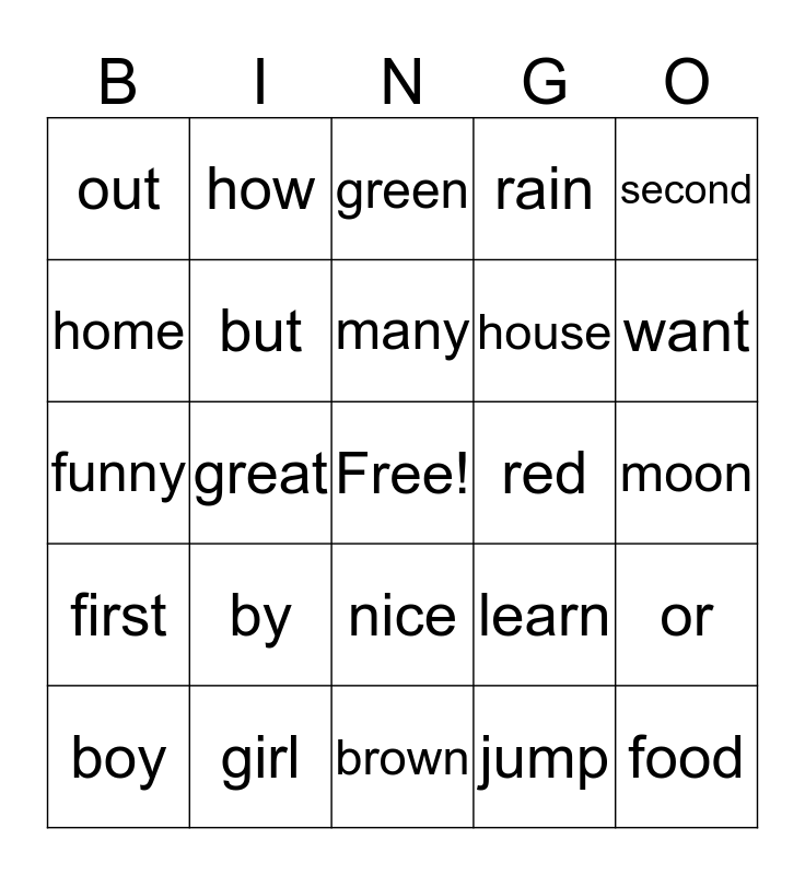 This bingo card has a free space and 29 words: boy, brown, great, other, out, green, but, by, red, girl, moon, food, brown, jump, want, thank, nice, first, second, funny, learn, some, house, home, rain, how, or, many and old.