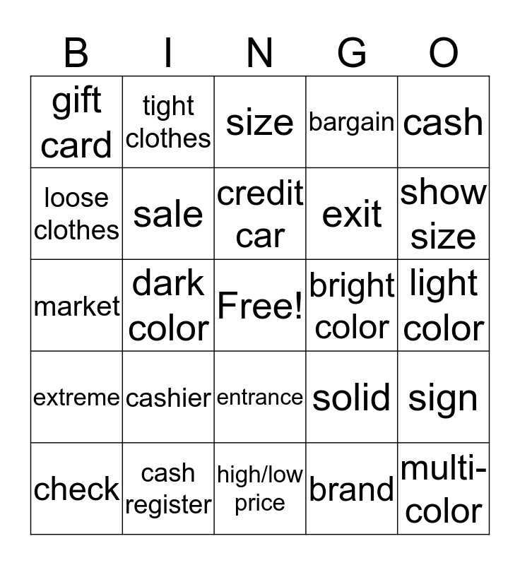 This bingo card has a free space and 24 words: cashier, cash register, credit car, check, cash, gift card, loose clothes, tight clothes, bright color, entrance, exit, market, solid, sign, sale, brand, light color, size, show size, dark color, multi- color, extreme, bargain and high/low price.