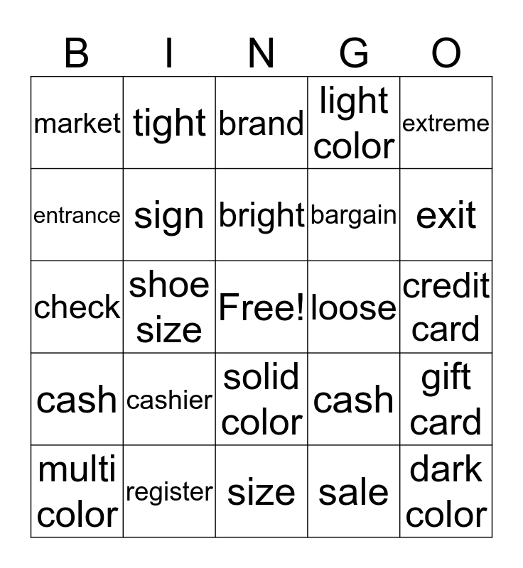 This bingo card has a free space and 24 words: cashier, register, bright, multi color, extreme, market, entrance, tight, loose, solid color, bargain, check, cash, gift card, sign, sale, credit card, brand, exit, shoe size, dark color, cash, light color and size.