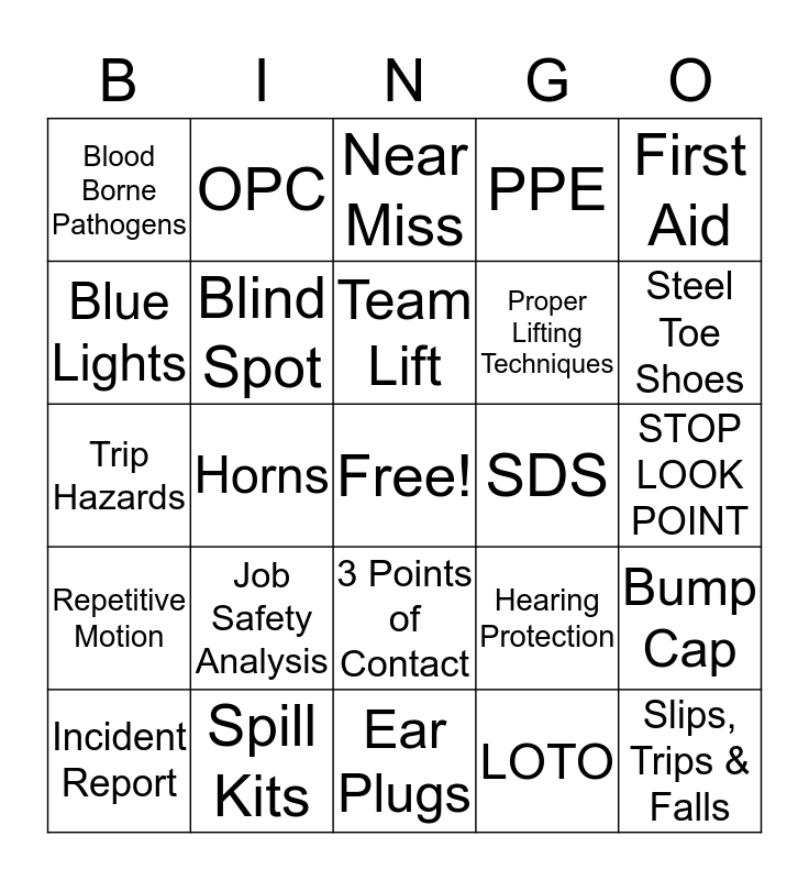 This bingo card has a free space and 34 words: RISK, LOTO, Pinch Point, Safety Glasses, Repetitive Motion, Blind Spot, First Aid, Incident Report, OPC, 5S, Team Lift, Near Miss, Safety First, Ladder Safety, SDS, Steel Toe Shoes, Spill Kits, Trip Hazards, Job Safety Analysis, Hearing Protection, 3 Points of Contact, Never Block Emergency Exits, Blood Borne Pathogens, STOP LOOK POINT, Ear Plugs, Slips, Trips & Falls, PPE, Recordable Injury, Proper Lifting Techniques, Blue Lights, Pedestrian Walkways, Horns, Bump Cap and Fall Protection.