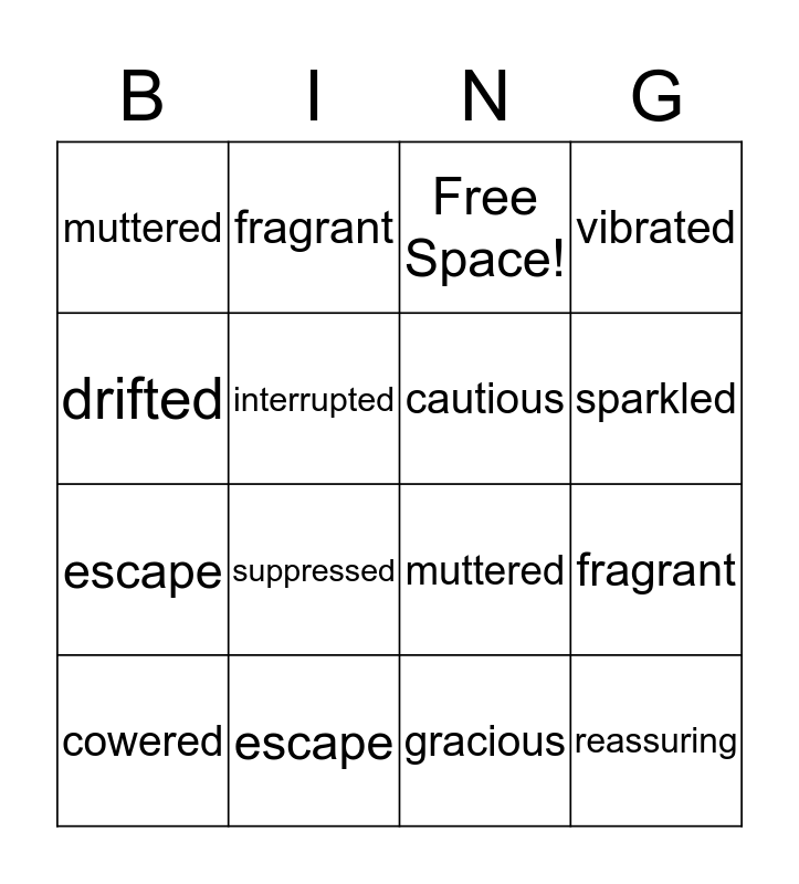 This bingo card has 16 words: escape, fragrant, Free Space!, muttered, escape, fragrant, muttered, gracious, drifted, interrupted, cowered, vibrated, suppressed, sparkled, cautious and reassuring.