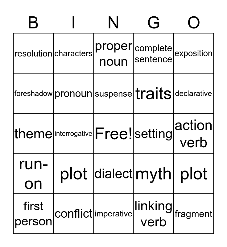 This bingo card has a free space and 24 words: plot, conflict, suspense, first person, exposition, resolution, foreshadow, characters, setting, dialect, traits, theme, myth, plot, pronoun, linking verb, action verb, proper noun, declarative, interrogative, fragment, run-on, complete sentence and imperative.