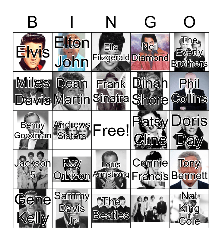 This bingo card has 33 images, a free space and 32 words: Marvin Gaye, The Drifters, Andrews Sisters, Aretha Franklin, Jackson 5, Dean Martin, The Everly Brothers, Gene Kelly, Elton John, The Temptations, Frank Sinatra, Ella Fitzgerald, Patti Page, Buddy Holly, Patsy Cline, Phil Collins, Sammy Davis Jr, Benny Goodman, Roy Orbison, Connie Francis, Louis Armstrong, Glen Miller, Elvis, Doris Day, The Beatles, Nat King Cole, Neil Diamond, Dinah Shore, Miles Davis, Tony Bennett, Charlie Parker and Simon & Garfunkel.