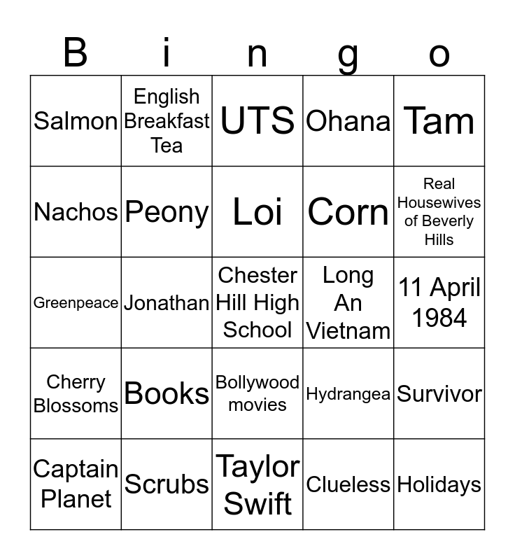 This bingo card has 36 words: Tony, Thomas, ANZ, Peony, Hydrangea, Cherry Blossoms, Loi, Kieu, Tam, Emily, Jonathan, Ohana, Chinkyz, Long An Vietnam, Real Housewives of Beverly Hills, Salmon, Holidays, Books, Chester Hill High School, UTS, 11 April 1984, Survivor, Scrubs, Captain Planet, Taylor Swift, English Breakfast Tea, Greenpeace, Small feet, Corn, Nachos, Avocado, New York, Clueless, Bollywood movies, Ironing and Choc rock cake.