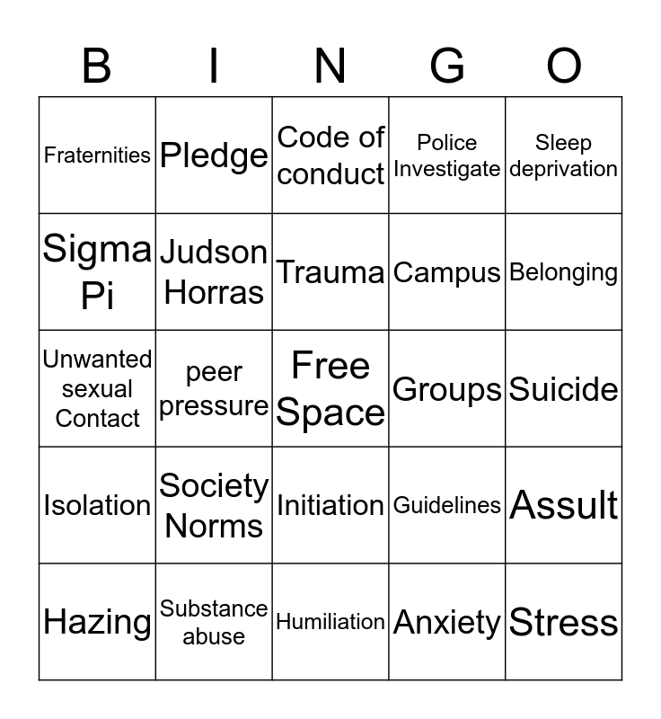This bingo card has a free space and 29 words: Hazing, alcohol poisoning, peer pressure, Ohio University, Fraternities, Code of conduct, Judson Horras, Society Norms, Groups, Substance abuse, Suicide, Stress, Humiliation, Anxiety, Belonging, Health, Initiation, Isolation, Sleep deprivation, Unwanted sexual Contact, Guidelines, Suspended, Campus, Sigma Pi, Police Investigate, Pledge, Assult, Trauma and Reinstated.