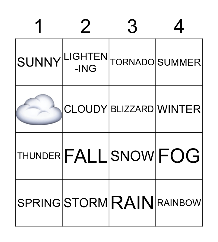 This bingo card has 1 images and 15 words: STORM, FOG, TORNADO, SUNNY, THUNDER, LIGHTEN -ING, SNOW, RAIN, CLOUDY, SPRING, SUMMER, FALL, WINTER, BLIZZARD and RAINBOW.
