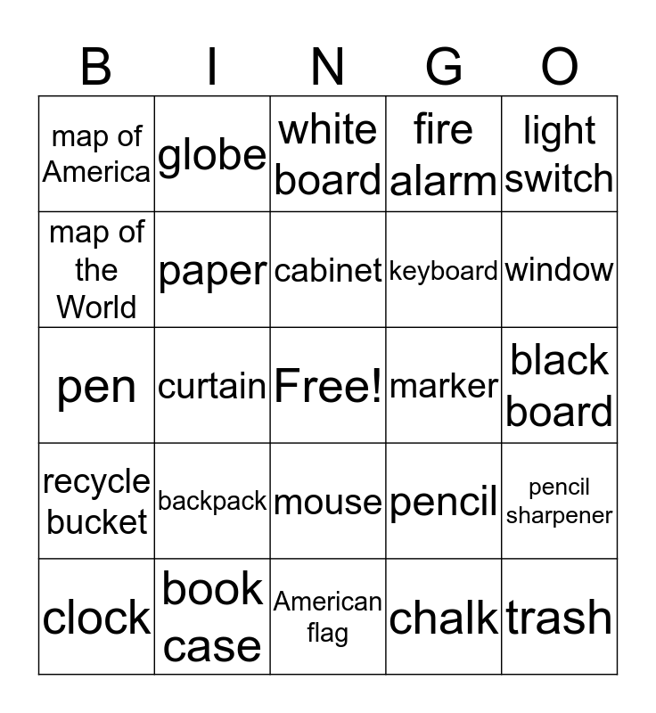 This bingo card has a free space and 24 words: backpack, book case, cabinet, clock, light switch, map of America, map of the World, globe, marker, mouse, keyboard, pen, pencil, pencil sharpener, paper, chalk, black board, white board, window, curtain, trash, recycle bucket, fire alarm and American flag.