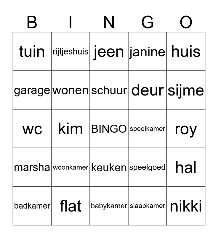 This bingo card has a free space and 24 words: woonkamer, flat, schuur, badkamer, huis, tuin, garage, rijtjeshuis, speelkamer, keuken, deur, wc, speelgoed, hal, wonen, slaapkamer, roy, jeen, sijme, kim, nikki, marsha, janine and babykamer.