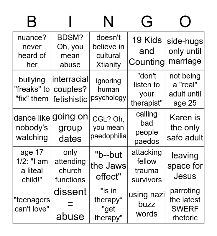 This bingo card has 25 words: only attending church functions, *is in therapy* "get therapy", ignoring human psychology, "teenagers can't love", side-hugs only until marriage, nuance? never heard of her, bullying "freaks" to "fix" them, BDSM? Oh, you mean abuse, calling bad people paedos, "b--but the Jaws effect", "don't listen to your therapist", dance like nobody's watching, attacking fellow trauma survivors, leaving space for Jesus, interracial couples? fetishistic, parroting the latest SWERF rhetoric, Karen is the only safe adult, doesn't believe in cultural Xtianity, not being a "real" adult until age 25, going on group dates, CGL? Oh, you mean paedophilia, dissent = abuse, age 17 1/2: "I am a liteal child!", 19 Kids and Counting and using nazi buzz words.