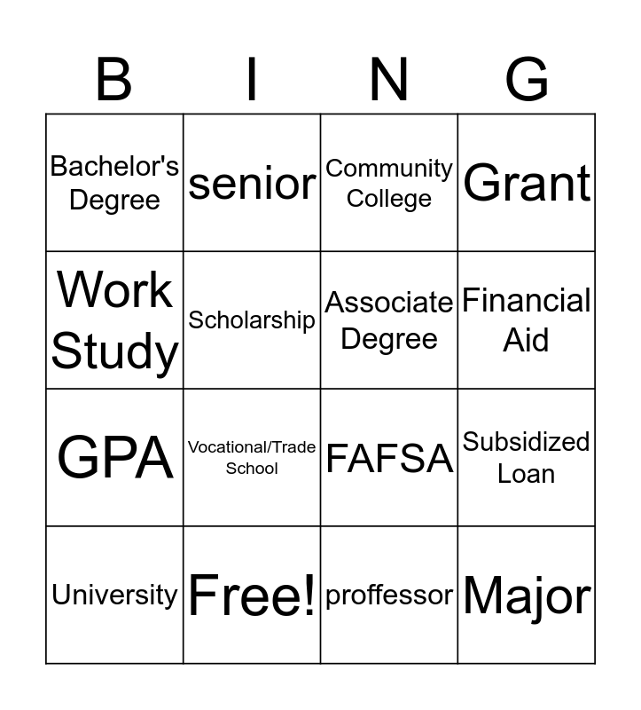This bingo card has 21 words: Free!, money, senior, trascript, proffessor, Associate Degree, Bachelor's Degree, Community College, FAFSA, Financial Aid, GPA, Grant, Major, Prerequisites, Scholarship, Tuition, University, Vocational/Trade School, Work Study, Subsidized Loan and Unsubsidized Loan.