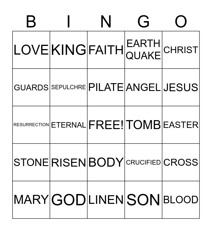 This bingo card has a free space and 24 words: RISEN, GOD, PILATE, MARY, CHRIST, LOVE, GUARDS, KING, TOMB, BODY, ANGEL, RESURRECTION, CRUCIFIED, CROSS, SEPULCHRE, SON, EASTER, FAITH, JESUS, ETERNAL, BLOOD, STONE, EARTH QUAKE and LINEN.
