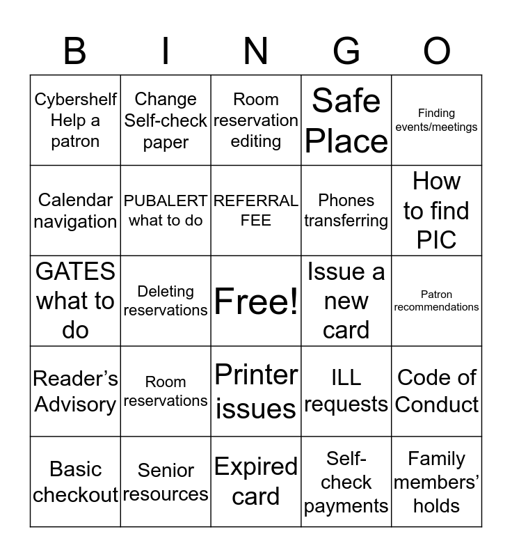 This bingo card has a free space and 24 words: Room reservations, Senior resources, REFERRAL FEE, Basic checkout, Finding events/meetings, Cybershelf Help a patron, Calendar navigation, Change Self-check paper, Issue a new card, Printer issues, Phones transferring, GATES what to do, ILL requests, Code of Conduct, PUBALERT what to do, Self-check payments, Patron recommendations, Room reservation editing, How to find PIC, Deleting reservations, Family members’ holds, Reader’s Advisory, Safe Place and Expired card.