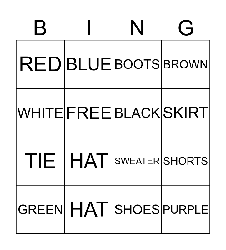 This bingo card has 24 words: JACKET, BLOUSE, SKIRT, GOVES, WHITE, RED, FREE, BLUE, HAT, YELLOW, TIE, SWEATER, SOCKS, RAINCOAT, BLACK, PINK, SHOES, BOOTS, HAT, SHORTS, GREEN, PURPLE, BROWN and ORANGE.
