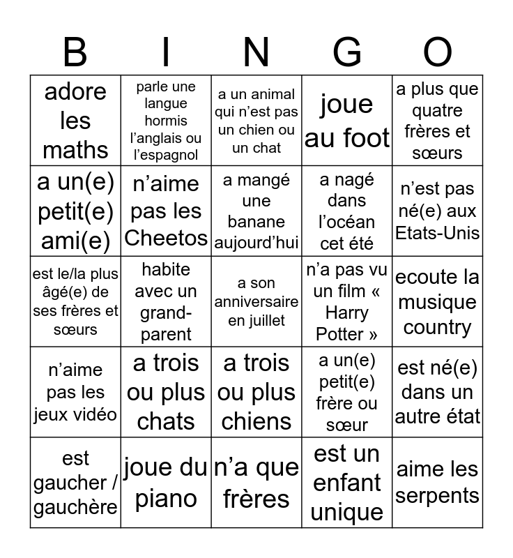 This bingo card has 44 words: a son anniversaire ce mois, a son anniversaire en juillet, a son anniversaire en janvier, est gaucher / gauchère, aime faire du camping, est un enfant unique, a un animal qui n’est pas un chien ou un chat, parle plus qu’une langue, a plus que quatre frères et sœurs, joue du piano, joue au foot, n’a pas vu un film « Harry Potter », a trois ou plus chiens, a trois ou plus chats, n’a que sœurs, n’a que frères, a un surnom qui a plus de 8 lettres, est le/la plus âgé(e) de ses frères et sœurs, est végétarien(ne), n’est pas né(e) aux Etats-Unis, parle une langue hormis l’anglais ou l’espagnol, porte un t-shirt bleu, porte un jean, adore les maths, aime faire du ski, ecoute la musique country, aime danser, a une allergie, a un(e) petit(e) frère ou sœur, n’aime pas les jeux vidéo, n’a pas de profil Instagram, est né(e) dans un autre état, est né(e) à Salt Lake City, n’habite pas à Salt Lake City, habite avec un grand-parent, aime les films d’horreur, joue au théâtre, aime les serpents, a mangé une banane aujourd’hui, a un(e) petit(e) ami(e), a nagé dans l’océan cet été, fait toujours ses devoirs, n’aime pas les Cheetos and aime l’opéra.