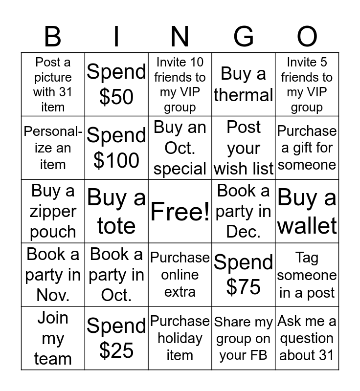 This bingo card has a free space and 24 words: Book a party in Oct., Spend $25, Buy an Oct. special, Join my team, Invite 5 friends to my VIP group, Post a picture with 31 item, Personal-ize an item, Spend $50, Book a party in Dec., Purchase online extra, Post your wish list, Buy a zipper pouch, Spend $75, Tag someone in a post, Spend $100, Share my group on your FB, Buy a wallet, Invite 10 friends to my VIP group, Purchase a gift for someone, Buy a tote, Ask me a question about 31, Book a party in Nov., Buy a thermal and Purchase holiday item.