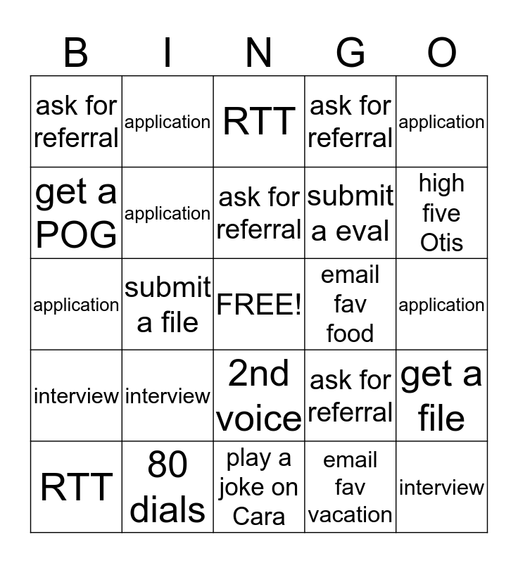 This bingo card has a free space and 24 words: interview, 80 dials, ask for referral, RTT, application, ask for referral, get a POG, application, email fav food, 2nd voice, submit a eval, application, ask for referral, get a file, application, email fav vacation, application, RTT, high five Otis, submit a file, interview, interview, ask for referral and play a joke on Cara.