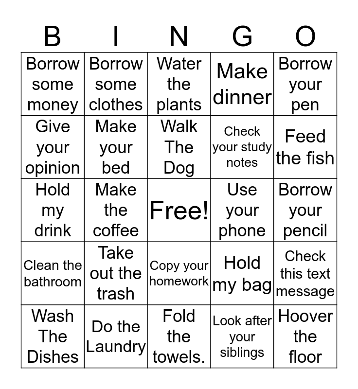This bingo card has a free space and 24 words: Take out the trash, Do the Laundry, Walk The Dog, Wash The Dishes, Borrow your pen, Borrow some money, Give your opinion, Borrow some clothes, Use your phone, Copy your homework, Check your study notes, Hold my drink, Hold my bag, Check this text message, Make your bed, Look after your siblings, Borrow your pencil, Water the plants, Feed the fish, Make the coffee, Hoover the floor, Clean the bathroom, Make dinner and Fold the towels..