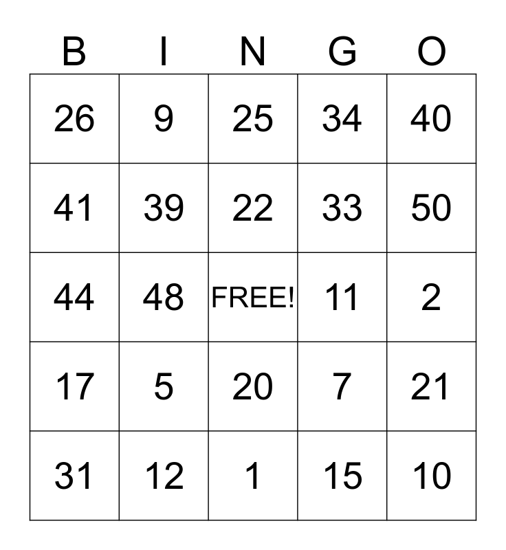 This bingo card has a free space and 24 words: 5, 12, 22, 31, 40, 26, 41, 9, 11, 20, 33, 44, 7, 21, 39, 15, 2, 25, 50, 48, 10, 17, 34 and 1.