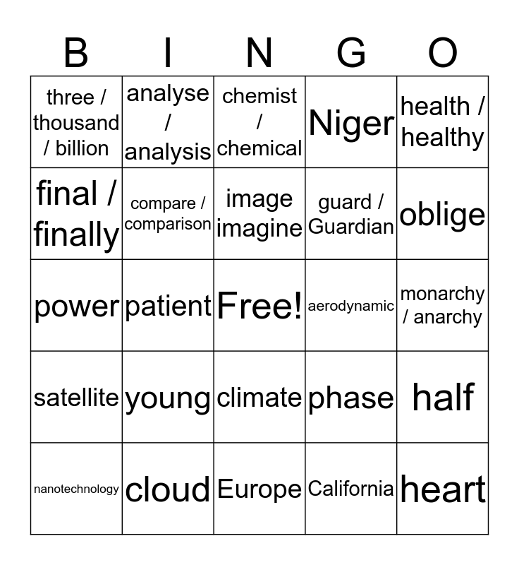 This bingo card has a free space and 205 words: hyper¬, hydro-, bio¬, micro-, about, accurate, advantage, affirm, although, analyse / analysis, answer, apple, archives, area, around, athlete, autonomy, base / basic, bomb, bought /caught, built, causes, child / children, clothes, cloud, compare / comparison, consider, create, crime, criterion / criteria, crucial, culture, current / currently, dangerous, democracy / democratic, determine, develop / development, difficult, discuss, double, doubt, enough, equal, famous, fashion, favour, final / finally, first / first of all, flood, foreign / foreigners, government, guard / Guardian, half, hierarchy, human, idea, identify, image imagine, interesting, introduction, isolated, journalist, key, knowledge, latest, law low, legal / illegal, live (N + Adj)/ live (V), major / minor, media, monarchy / anarchy, money, months, Muslim, nature, notice, oblige, occur, ocean, other, particular, period, phase, phenomenon, pilot, practice, primary, profile, promise / promising, public, private / privacy, purpose, put, receive, recipe, republic, responsible, results, return, reveal, said, salt, sign / signal, social / society, stable, status, study / studied / students, suit, three / thousand / billion, touch, walk, water, weapons, wind, woman / women, work, write / written, young, budget, chaos, client, crisis, diagram, director, economy / economic, engineer / engineering, finance / financial, firm, focus, globalization, industry / industrial, infrastructure, label, percent, product / production, quantity / quality, aerodynamic, Airbus, algorithm, cable, carbon dioxide / CO2, chemist / chemical, circuit, climate, engine, environment / environmentally, fossil fuels, hybrid, laser, measure, nanotechnology, nuclear, patent, pesticide / herbicide, power, pressure, radar, radioactive, research, Richter scale, satellite, science / scientific / scientists, sphere, surface, textile, thermo-dynamics, turbine, wifi, anesthesia, antibiotic, blood, breath / breathe, diabetes, diet, disease, gene / genetics, health / healthy, heart, height / weight, membrane, muscle, obese / obesity, patient, psychology / psychological /psychologist, primate, species, therapeutic, countries, earth / earthquake, Europe, Britain, California, China, Egypt, Israel, Japan, Niger, Norway / Norwegian, south / southern, Tunisia, UK, Asia / Asian, island, region and world.