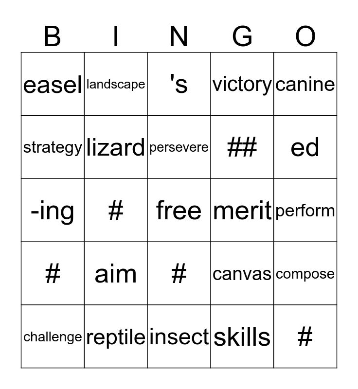 This bingo card has a free space and 24 words: challenge, aim, persevere, skills, canine, easel, landscape, 's, merit, perform, -ing, lizard, canvas, compose, strategy, reptile, insect, victory, ed, #, #, #, ## and #.