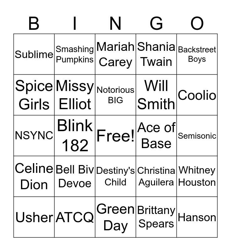This bingo card has a free space and 27 words: Nirvana, ATCQ, Notorious BIG, Brittany Spears, Backstreet Boys, Spice Girls, Smashing Pumpkins, Green Day, Ace of Base, Whitney Houston, Celine Dion, Missy Elliot, Christina Aguilera, Hanson, NSYNC, Ricky Martin, Mariah Carey, Shania Twain, Semisonic, Sublime, Bell Biv Devoe, Destiny's Child, Will Smith, Coolio, Usher, Blink 182 and MC Hammer.