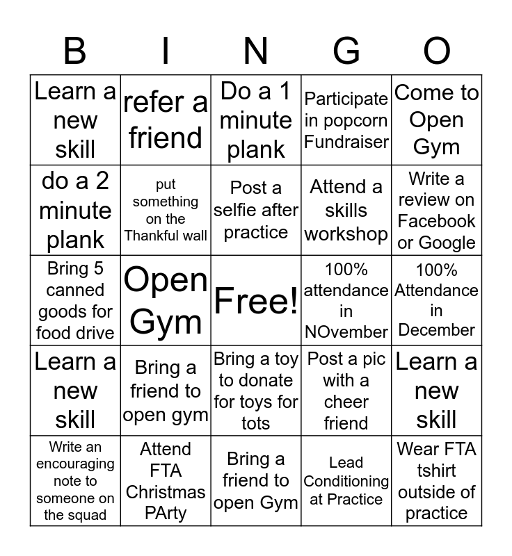 This bingo card has a free space and 24 words: Bring a friend to open gym, Attend FTA Christmas PArty, Post a selfie after practice, Write an encouraging note to someone on the squad, Come to Open Gym, Learn a new skill, do a 2 minute plank, refer a friend, 100% attendance in NOvember, Bring a toy to donate for toys for tots, Attend a skills workshop, Bring 5 canned goods for food drive, Post a pic with a cheer friend, Learn a new skill, put something on the Thankful wall, Lead Conditioning at Practice, 100% Attendance in December, Do a 1 minute plank, Write a review on Facebook or Google, Open Gym, Wear FTA tshirt outside of practice, Learn a new skill, Participate in popcorn Fundraiser and Bring a friend to open Gym.