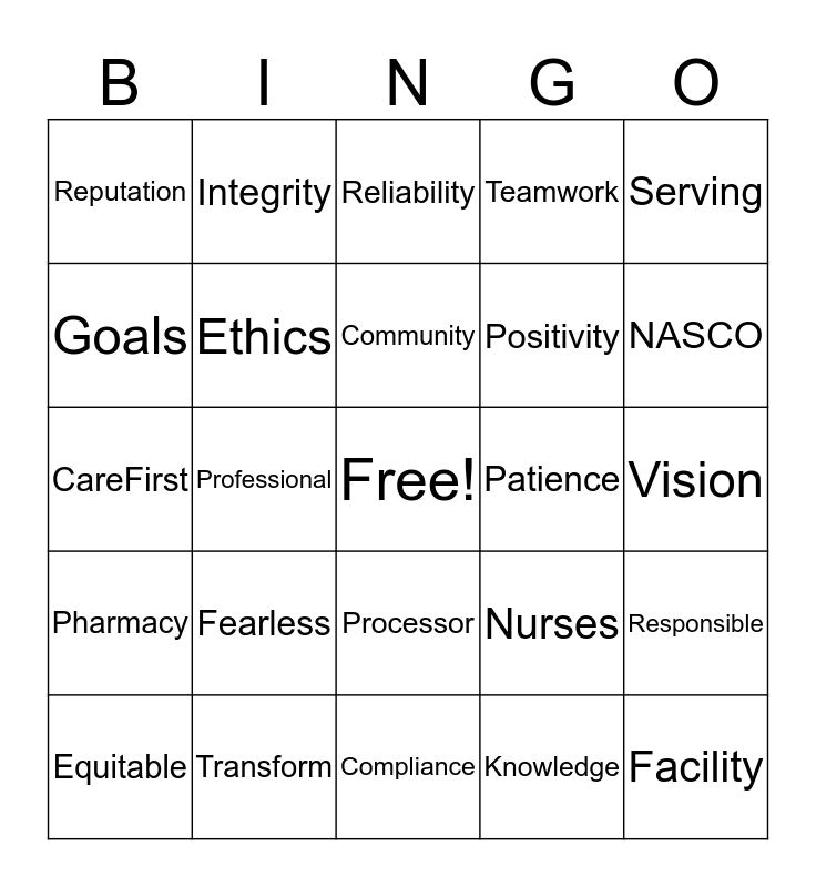 This bingo card has a free space and 70 words: Volunteer, Vision, Value, Trust, Transform, Training, Teamwork, Solutions, Serving, Sales, Responsible, Respect, Reputation, Reliability, Quality, Professional, Processor, Positivity, PHI, Pharmacy, Patience, Nurses, NASCO, Mission, Member, Medicare, Learning, Leadership, Knowledge, Kindness, Integrity, Insurance, Insurance, Innovate, Informatics, Host, Home, HIPAA, Healthcare, Goals, Friendly, Fearless, Facility, Expand, Excellence, Ethics, Equitable, Enrollment, eFDE, EEC, Diversity, Dental, Customer, Convenience, Compliance, Compass, Community, Commitment, Collaborative, Claim, CareFirst, Care, BlueShield, BlueCross, Bluecard, Benefits, Affordable, Adjuster, Accountable and Access.