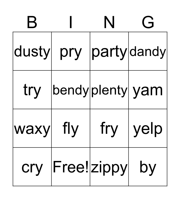 This bingo card has 30 words: yes, yap, yelp, yell, dusty, party, plenty, misty, Free!, crusty, zippy, cry, shy, why, fly, spy, my, by, sty, try, fry, dry, pry, waxy, bendy, dandy, baggy, muddy, yam and yack.