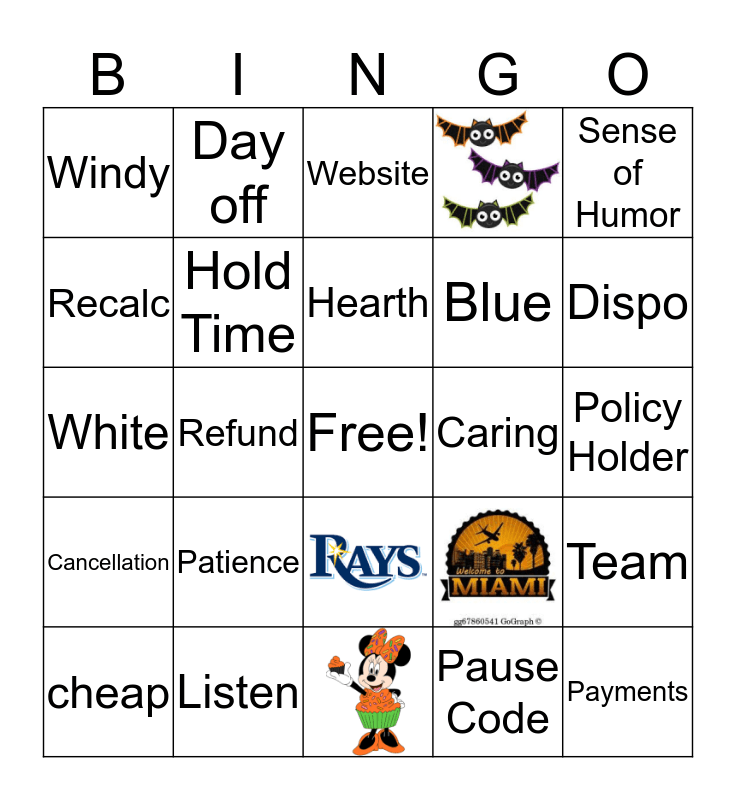 This bingo card has 4 images, a free space and 20 words: Patience, Listen, Hearth, cheap, Sense of Humor, Windy, Recalc, Day off, Caring, Blue, White, Team, Hold Time, Pause Code, Policy Holder, Website, Dispo, Refund, Payments and Cancellation.